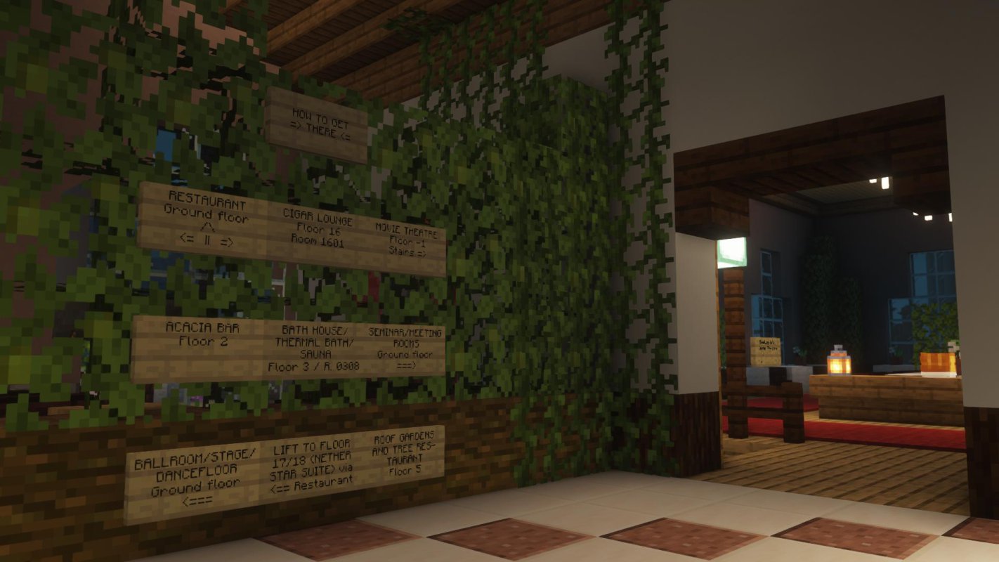 18 Etagen purer Luxus laden zum Verweilen ein. Von Zigarren-Lounge bis Römisches Dampfbad bleibt hier keine Annehmlichkeit ausgespart. Die Zimmer sind in verschiedenen "tiers" (Ausstattungsstufen) anmietbar. Sie beginnen bei einfachen kleinen Räumlichkeiten und verfügen in den höchsten Stufen über unterquerbare Aquarien, Whirlpools mit Blick über die Stadt und vieles mehr. Dank ZARazor91 und dem Denizen Plugin ist der Portier an der Rezeption voll funktionsfähig und überreicht dir, den passenden Geldbeutel vorausgesetzt, gerne deine Zimmerkarte.